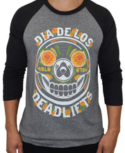Marigold Dia de los Deadlifts® logo on Heather Black with Grey 3/4 Raglan