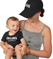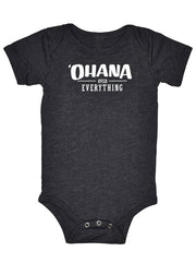Ohana Over Everything® logo on Charcoal Grey Baby Onesie