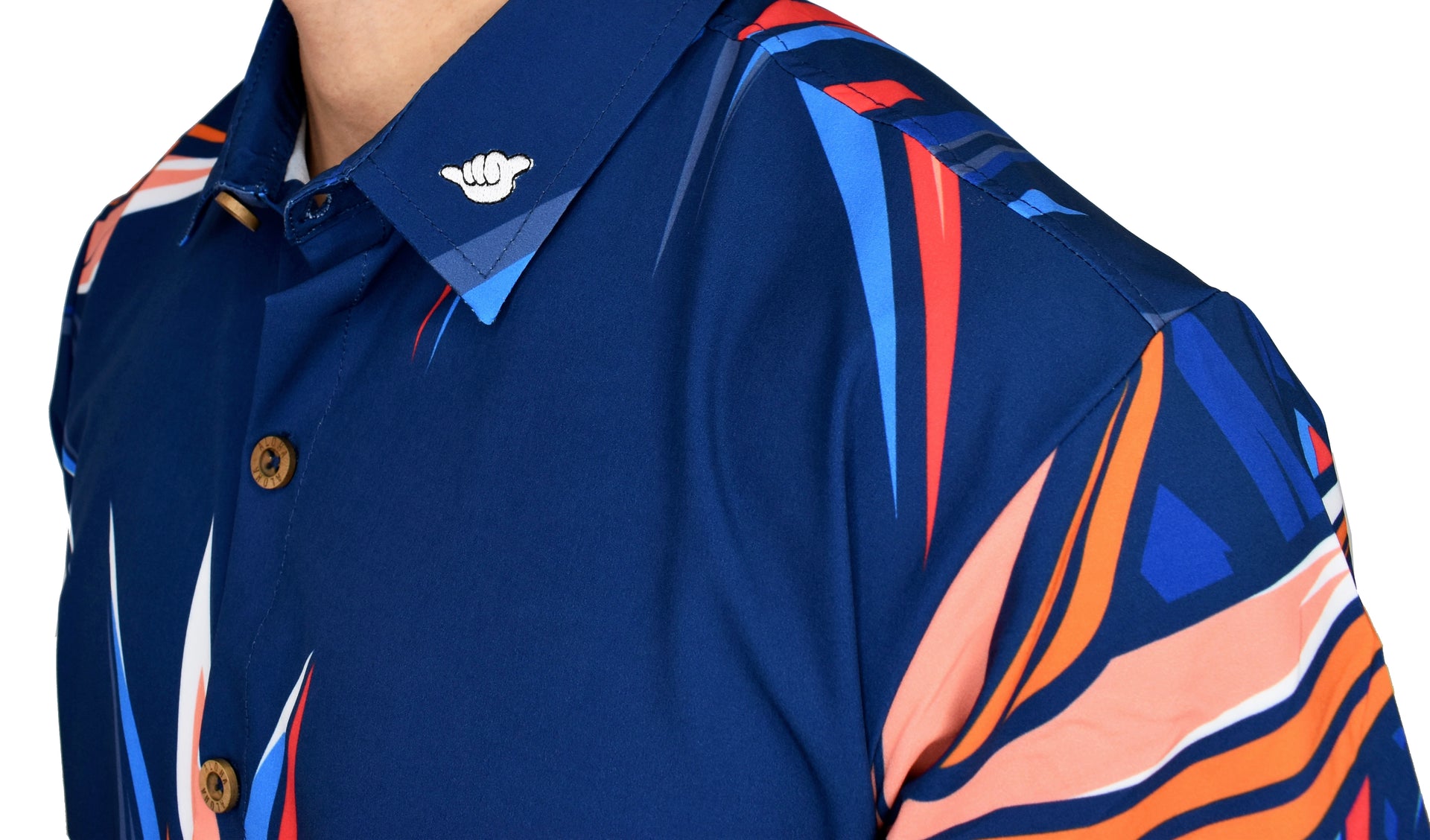 This shirt also features an embroidered shaka on the collar.